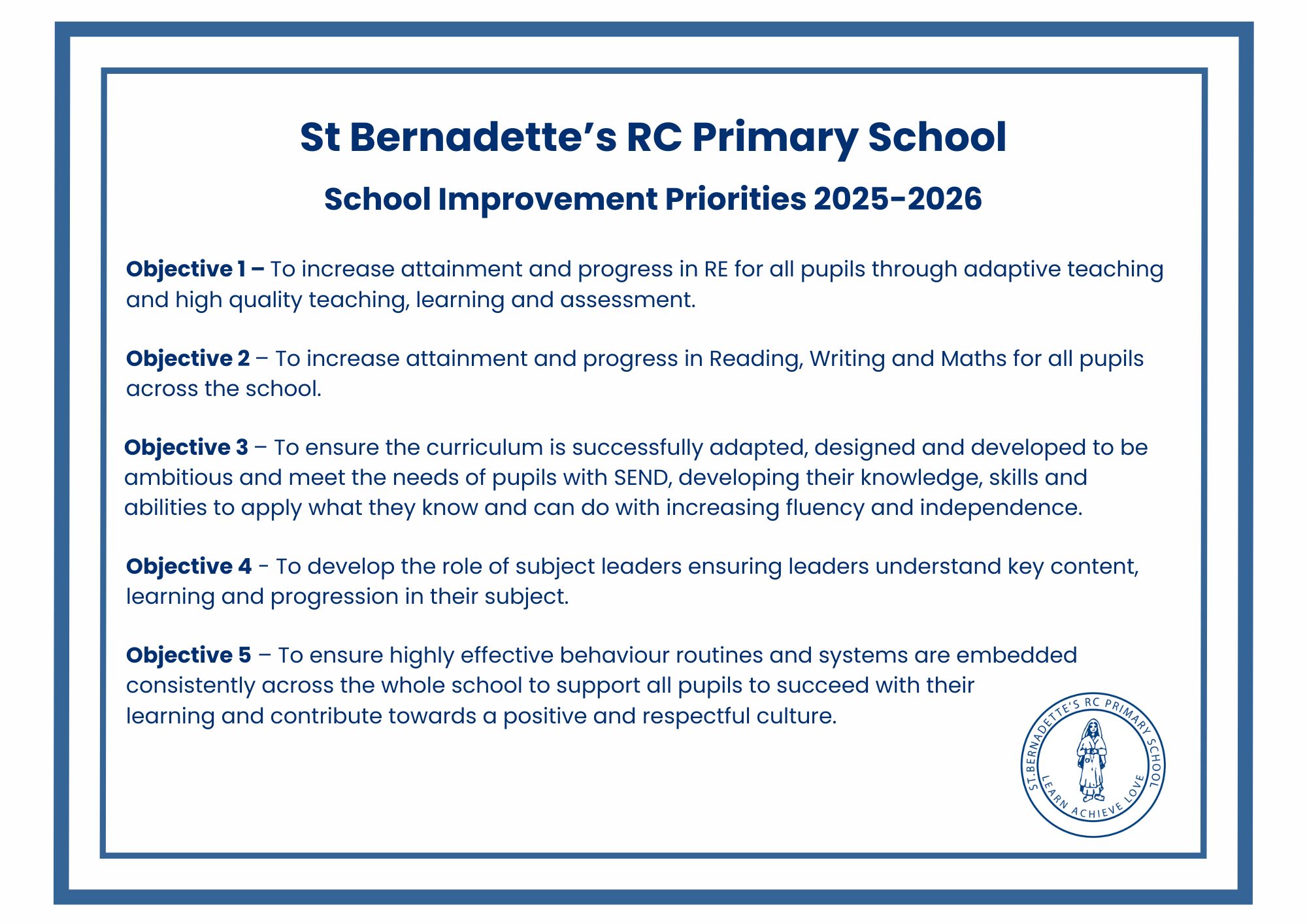 Please click here to learn more about our current priorities to improve St Bernadette’s and ensure that: